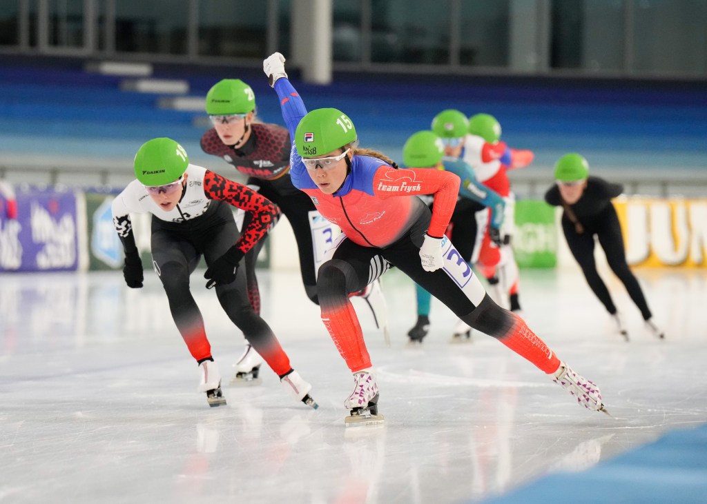 Massastarts in de kleuren van Bouwbedrijf de Vries & racen op de langebaan in het paars van Team FrySk